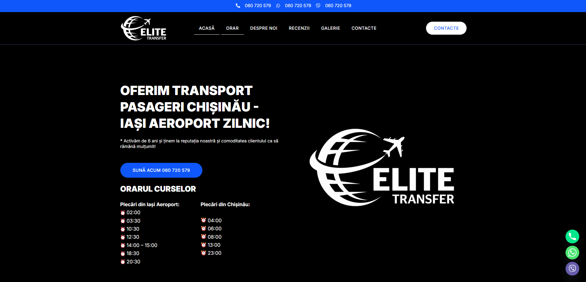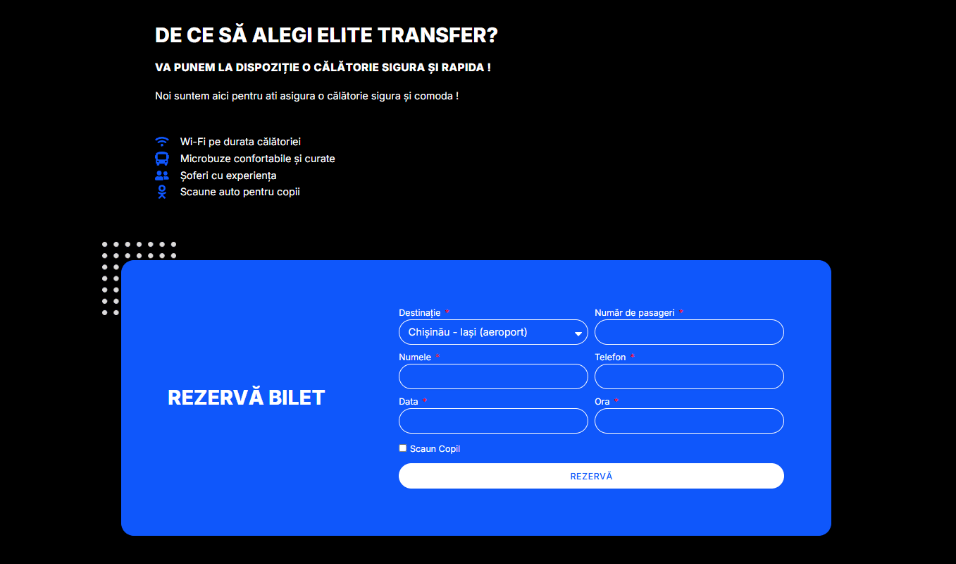 Elite Transfer este o companie de referință în Republica Moldova, specializată în furnizarea de soluții profesionale de transport de pasageri și colete. Scopul proiectului a fost crearea unei platforme digitale care să oglindească standardele înalte de siguranță și complexitatea serviciilor oferite, transformând experiența utilizatorului într-un proces fluid, de la informare până la rezervarea serviciului dorit.