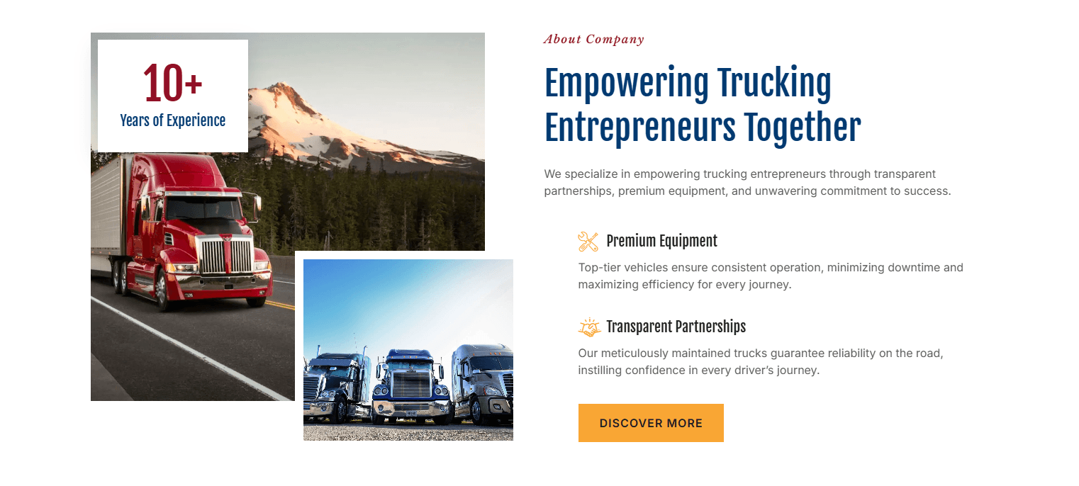Am utilizat elemente grafice pentru a reflecta succesul brandului în cifre, evidențiind experiența vastă și capacitatea de execuție în transportul de mărfuri la nivel național.
