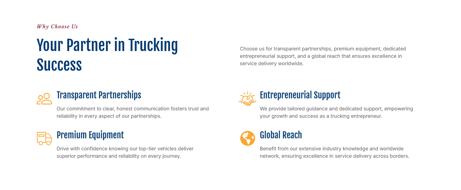 Obiectivul principal a fost crearea unei structuri digitale autoritare care să comunice clar capacitatea logistică pe teritoriul SUA. Provocarea a constat în organizarea serviciilor de tip Full Truckload (FTL) și a soluțiilor de transport specializat într-o manieră care să inspire încredere imediată expeditorilor și să demonstreze profesionalismul echipei în gestionarea unor lanțuri de aprovizionare critice.