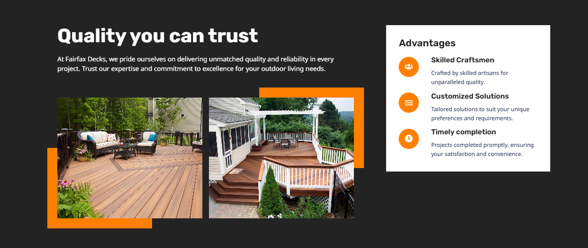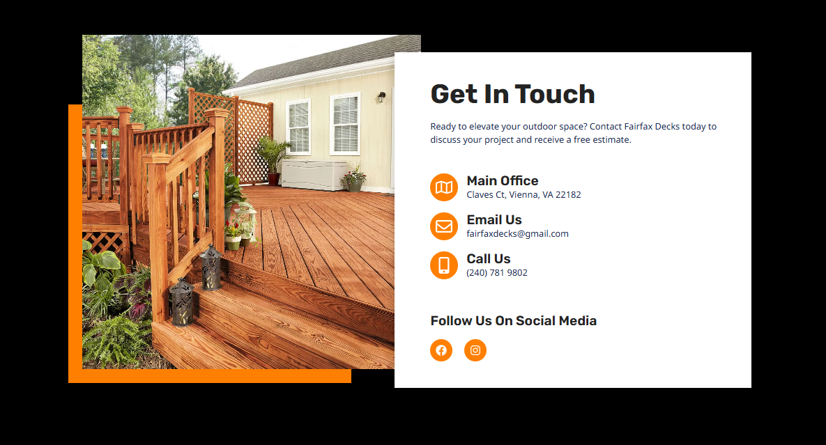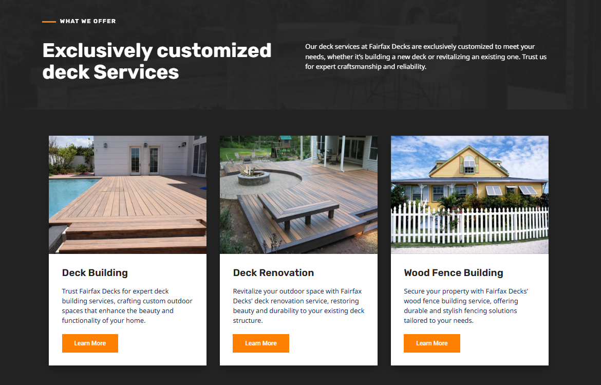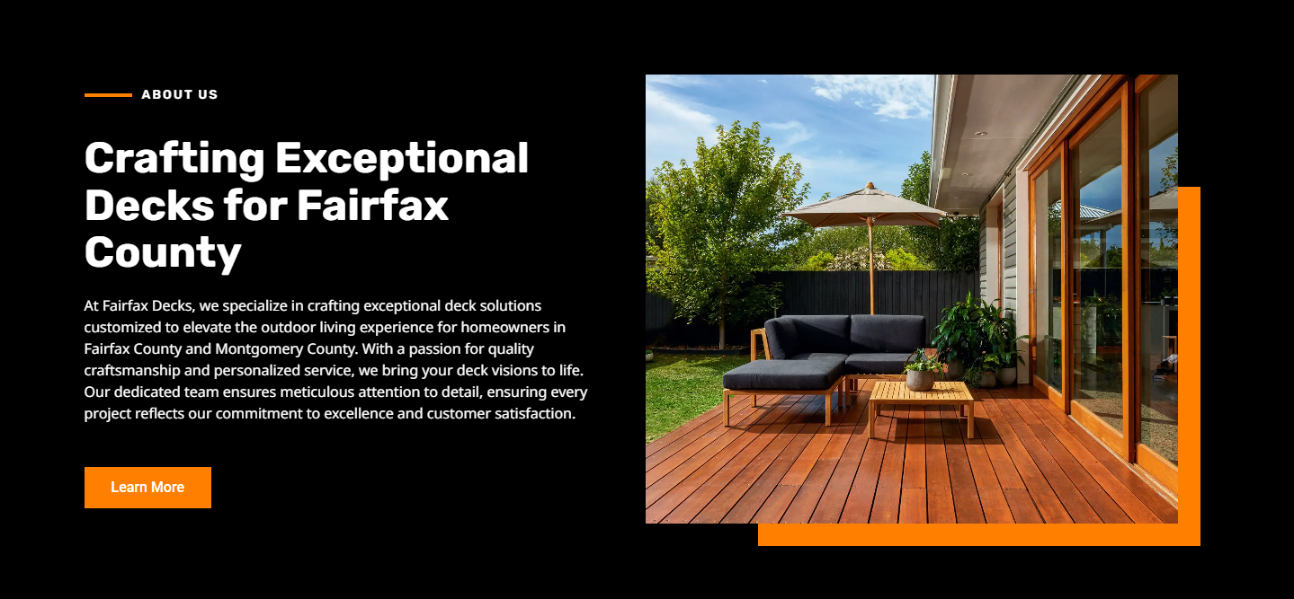 Fairfax Decks este un reper de profesionalism în industria construcțiilor de terase din Virginia, Maryland și DC, oferind soluții complete de design și execuție. Scopul proiectului a fost crearea unei platforme digitale care să reflecte standardele înalte de calitate și precizie ale brandului, facilitând transformarea viziunilor clienților în structuri exterioare durabile și estetice.