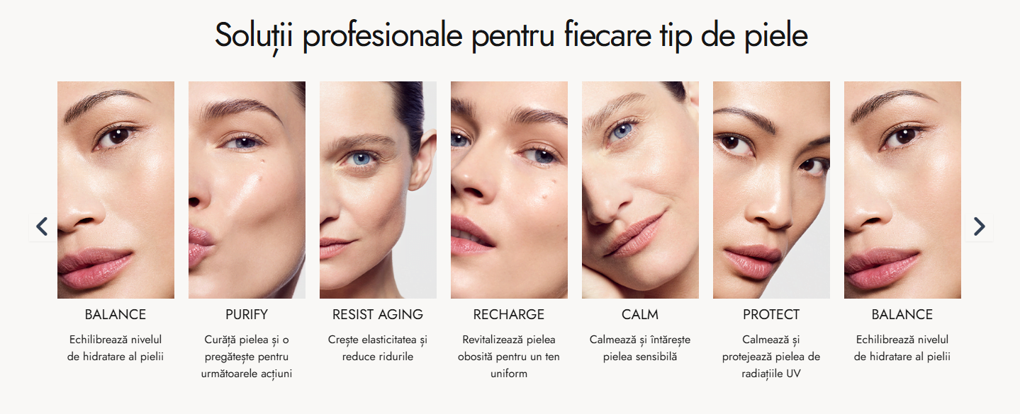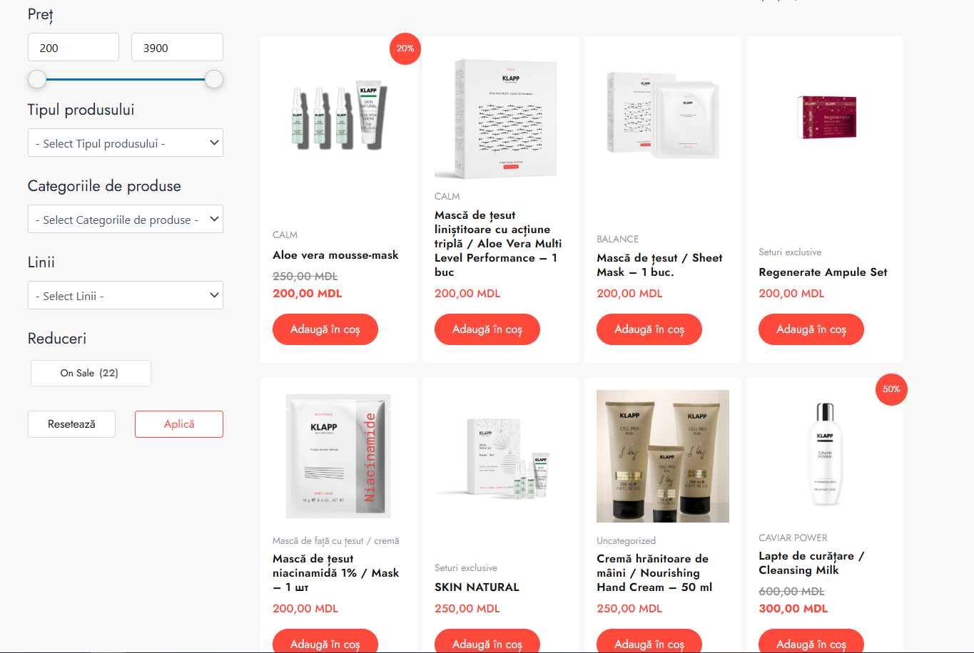 Am structurat produsele pe categorii specifice (Curățare, Seruri, Măști) și nevoi ale pielii (Calm, Purify, Resist Aging), permițând o navigare intuitivă și rapidă.